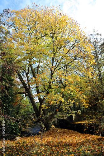 © Judith, Fototapeta premium Tree and bridge in Rowsley Derbyshire in Autumn