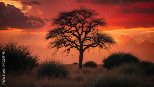 © AbstractAI, Obraz premium Tree and shrub silhouettes against a fiery sunrise sky during a cloudy day in the bushveld contrast photo