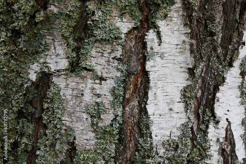Obraz premium Tree bark texture (birch) covered with moss and lichen. Macro