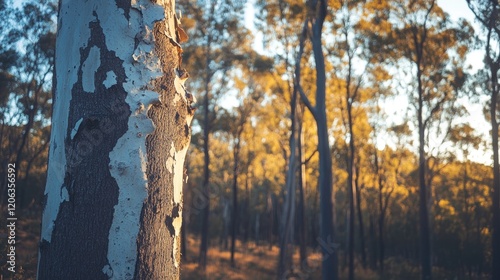 © Penatic Studio, Fototapeta premium Tree Bark Texture In A Golden Forest Setting