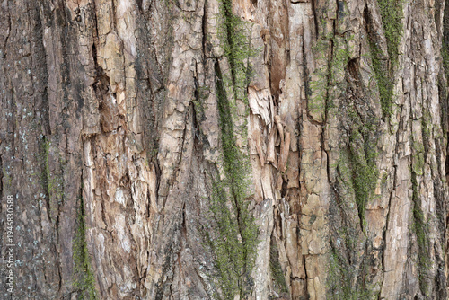 © Bowonpat, Obraz premium Tree bark texture with green moss growing on trunk