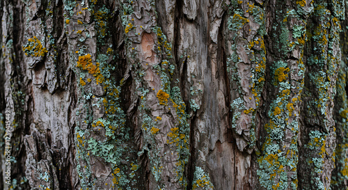 Obraz premium tree bark with deep grooves, cracks, and patches of lichen