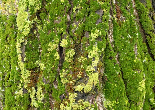 © moreidea, Obraz premium Tree bark with green moss natural background