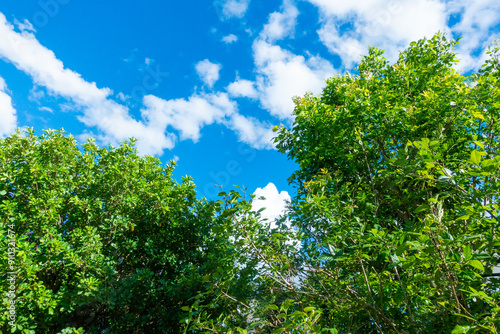 © wanatithan, Obraz premium Tree branch on blue sky background ,Summer background concept,home garden in vacation time.