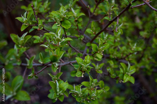 © manhattan_art, Obraz premium Tree branch with green leaves and buds background