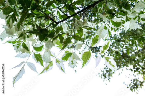 Fototapeta premium Tree branch with white-green leaves against the sky