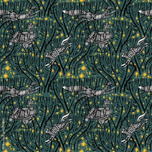 Obraz premium Tree branches at dreamy starry night with animals and birds seamless pattern...