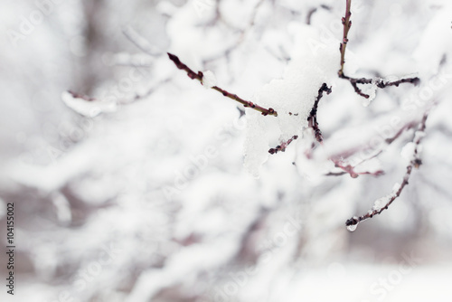 © andreaobzerova, Obraz premium Tree branches covered in snow, winter abstract background