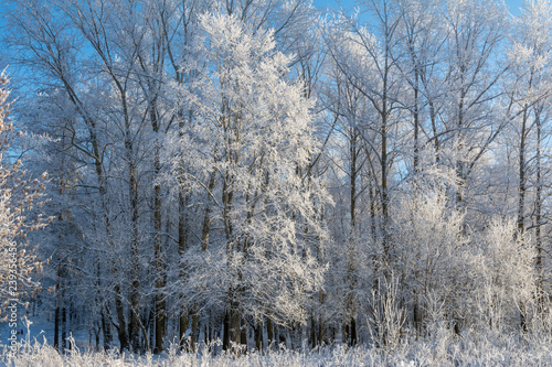 Fototapeta premium Tree branches covered with snow and frost