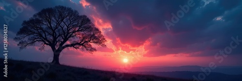 © Prasert, Obraz premium Tree branches stretch towards the darkening sky, lone, branchless, solitary