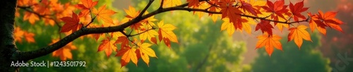 © yuwaree, Fototapeta premium Tree branches with bright yellow red green leaves in a garden, botanical, foliage