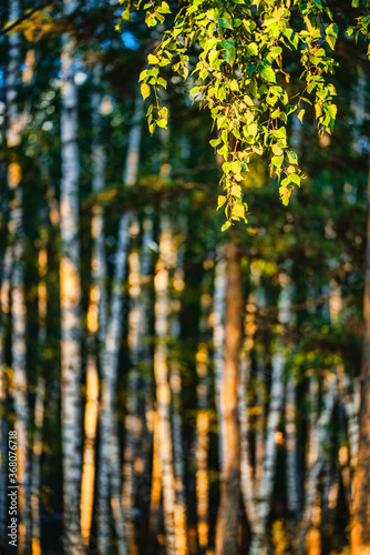Fototapeta premium tree branches with green leaves on background of blurred forest at sunny day