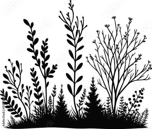 © Sumaiya, Naklejka premium Tree, bushes & Foliage black silhouette vector illustration on isolated white background