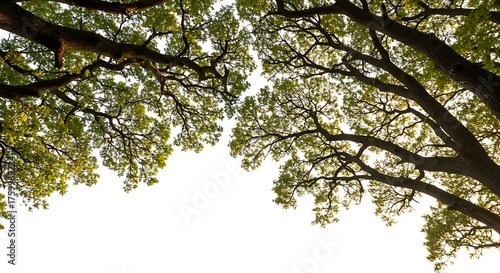 Obraz premium Tree canopy branches reaching toward bright sky with copy space background