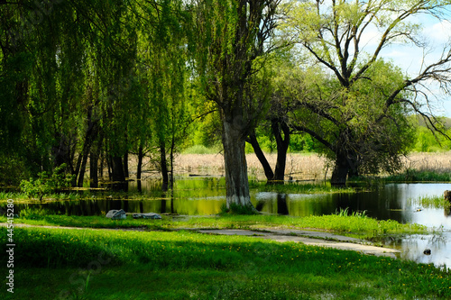 © Ahapen, Fototapeta premium Tree foliage in morning light with sunlight during summertime.