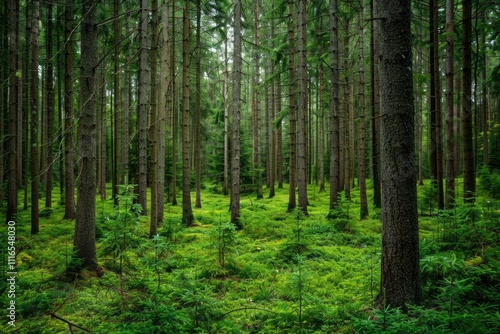 © Maryna, Obraz premium Tree Forest. Lush Green Spruce and Pine Trees in a Sustainable Timberland Ecosystem