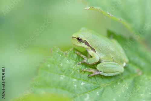 © Staffan Widstrand, Naklejka premium Tree frog on a green leaf