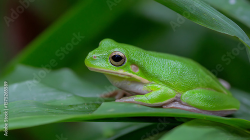 Naklejka premium Tree frog resting on a vibrant leaf, bathed in soft sunlight - nature's...