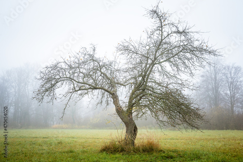 © Ewald Fröch, Obraz premium Tree in a fog.Apple tree with fallen down leaves