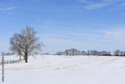 © junej, Fototapeta premium Tree in Snow Covered Field with Blue Sky
