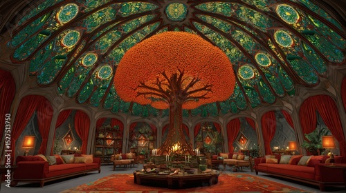 Obraz premium Tree in Stained Glass Dome Room with Sofas
