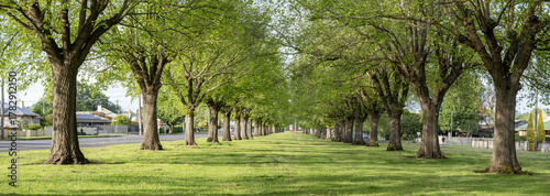 © Doublelee, Obraz premium Tree-lined avenue in Camperdown, Victoria, Australia, featuring symmetrical rows of mature deciduous trees creating a canopy over a grassy median. Regional towns and spacious green public spaces