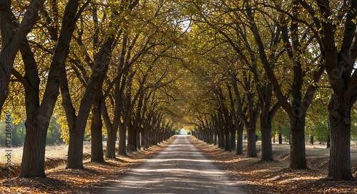 © Nft, Fototapeta premium Tree lined avenue perspective with sunlight through the leaves nature scenery