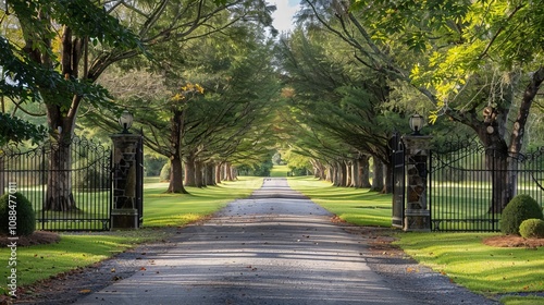 © maleyka, Obraz premium Tree-lined driveway leads to a country home, visible through black iron gates.