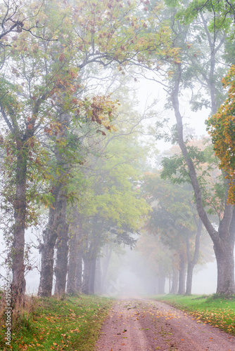© Lars Johansson, Obraz premium Tree lined gravel road in autumn mist