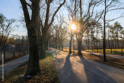 © were, Naklejka premium Tree-lined path at sunrise in Augsburg, Germany – February 19, 2025