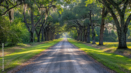 © Muhammad, Obraz premium Tree-lined road with lush green foliage on a sunny day