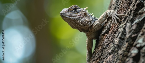 © The 2R Artificiality, Fototapeta premium Tree lizard descending from a tree in a close-up shot.