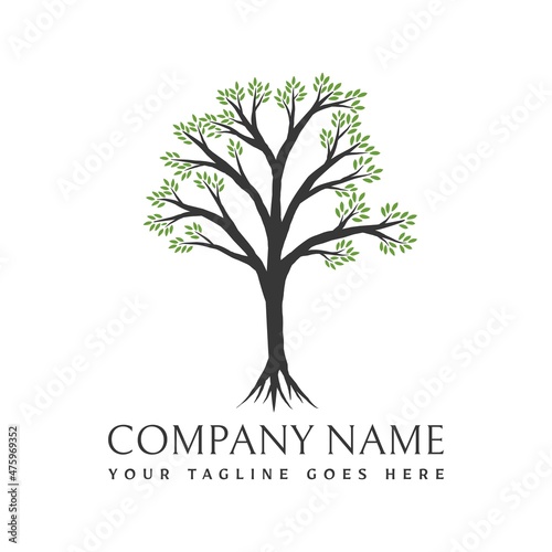 © orendesain99, Obraz premium Tree logo design. Vector illustration of a tree with branching branches and green leaves