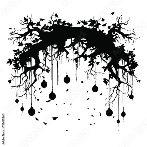 Naklejka premium tree, nature, vector, illustration, silhouette, branch, leaf, design, plant, floral, black, flower, art, drawing, decoration, pattern, spring, bird, element, season, frame, forest, leaves, old, trunk,