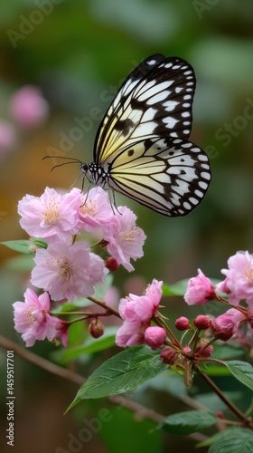 © Liudmyla, Naklejka premium Tree Nymph Butterfly Feeds on Pink Cherry Blossoms in a Springtime Garden