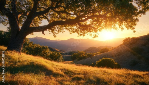 © ngalong project, Fototapeta premium Tree on a grassy hill with mountains in the background at sunset.