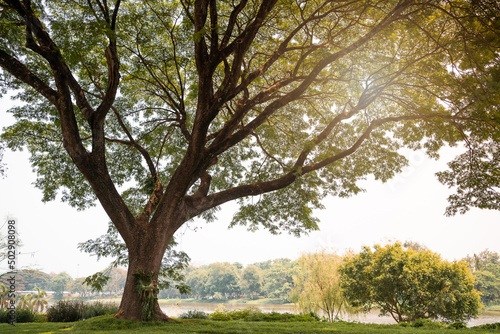 © wuanxiang, Obraz premium Tree on green grass landscape with sunlight.