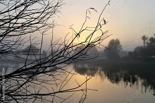 © Aleksandra, Fototapeta premium tree on the lake during sunrise
