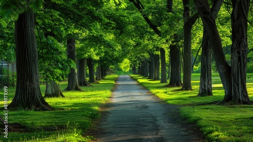© Serhii, Naklejka premium Tree Path. Peaceful Path in a Green Park Surrounded by Trees and Nature