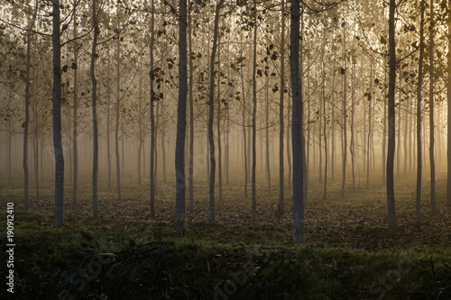 © Toni Sirera, Naklejka premium Tree plantation in a foggy day