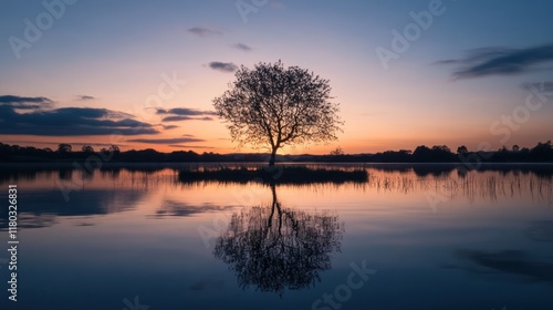 Fototapeta premium Tree reflects in water at sunrise with sky background, used for nature scenes