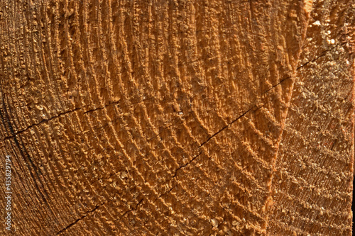 Naklejka premium Tree rings old weathered wood texture with the cross section of a cut log.