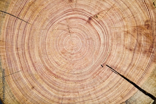 © ST-art, Naklejka premium Tree rings texture close up. Saw cut of an arctic pine trunk close-up. Tree rings on an arctic pine split. Tree rings of pine close-up. Fragment of Pine log walls. Walls of wooden log house close up.
