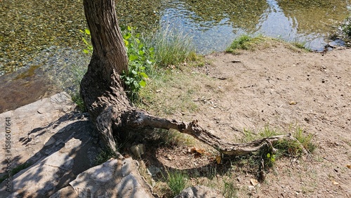 © IA Tuga, Fototapeta premium Tree Root Extending Toward River on a Sunny Shore