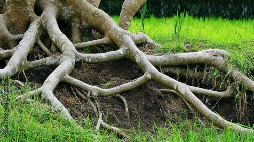 Fototapeta premium Tree Roots Emerging from Soil in a Lush Green Environment