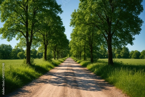 © vxnaghiyev, Obraz premium Tree Shadows Cast Over a Rural Dirt Track