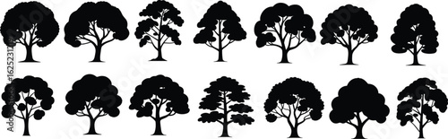 Fototapeta premium Tree Silhouettes, Black Vector Foliage Icons, Diverse Tree Shapes, Nature...