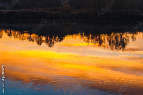 © dziewul, Fototapeta premium tree silhouettes reflected in the mirror during sunset