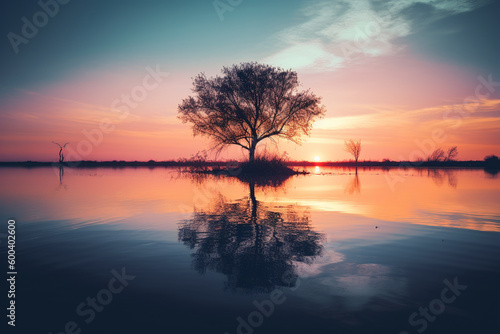 Fototapeta premium Tree standing in the water during a breathtaking sunset, with its reflection creating a sense of calm and tranquility. Ai generated