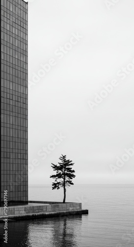 Fototapeta premium Tree stands beside modern architecture on waterfront